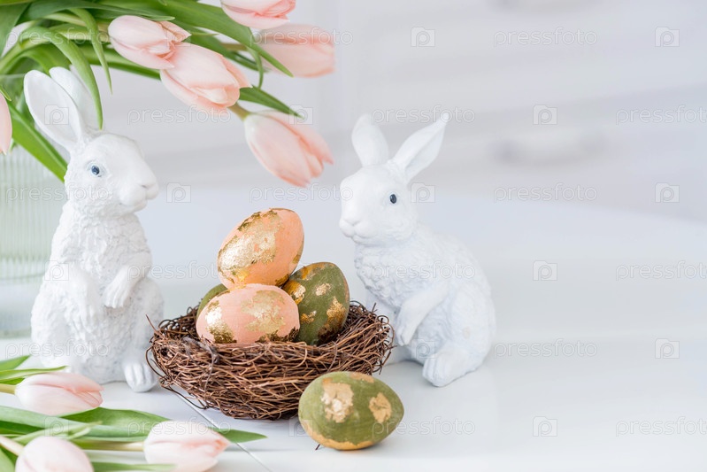 Красивая пасхальная открытка. букет нежных тюльпанов, пасхальных кроликов и золотых яиц на столе в белом кухонном интерьере