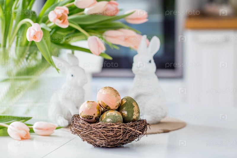 Красивая пасхальная открытка. букет нежных тюльпанов, пасхальных кроликов и золотых яиц на столе в белом кухонном интерьере