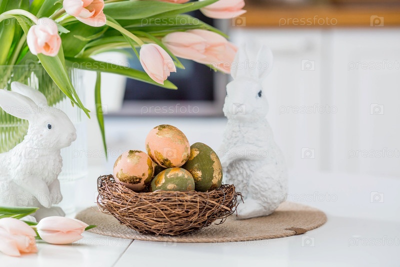 Красивая пасхальная открытка. букет нежных тюльпанов, пасхальных кроликов и золотых яиц на столе в белом кухонном интерьере