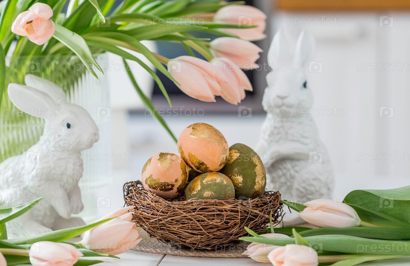 Красивая пасхальная открытка. букет нежных тюльпанов, пасхальных кроликов и золотых яиц на столе в белом кухонном интерьере