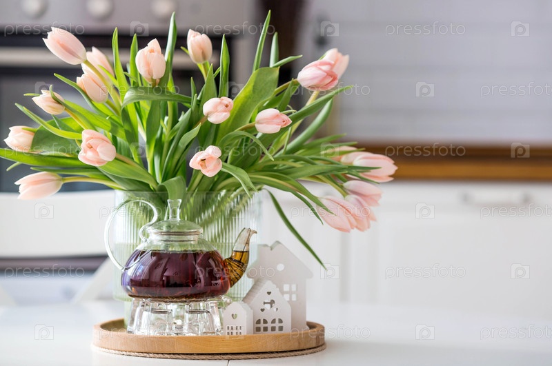 Букет весны, нежные тюльпаны и чайник на столе в белом кухонном интерьере.Концепция домашнего декора и уюта.Весна