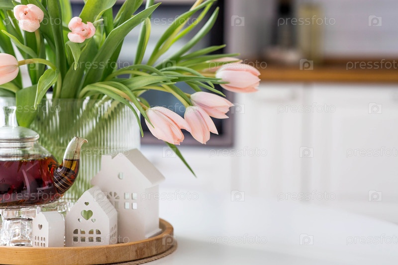 Букет весны, нежные тюльпаны и чайник на столе в белом кухонном интерьере.Концепция домашнего декора и уюта.Весна