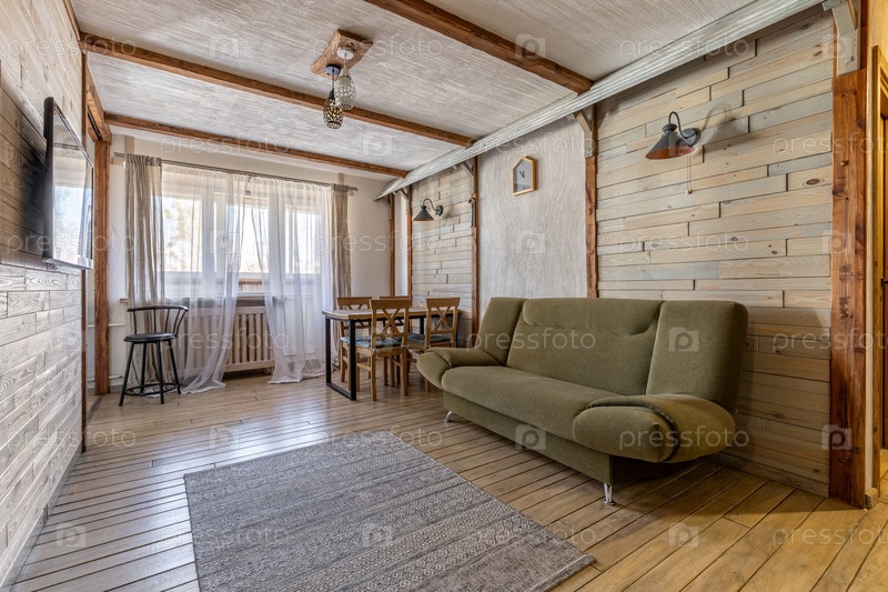 Современная красочная гостиная с зеленым диваном и деревянными стенами