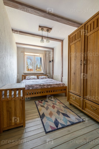 Яркая деревянная спальня с уютной двуспальной кроватью