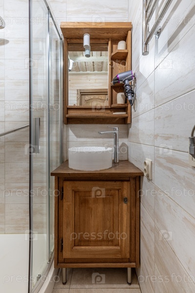 Компактный интерьер ванной комнаты с деревянным шкафом и современным стоком