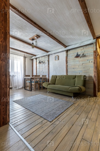 Яркая уютная гостиная с деревянными стенами, зеленый диван, обеденный стол и теплым естественным светом, создавая спокойную атмосферу села
