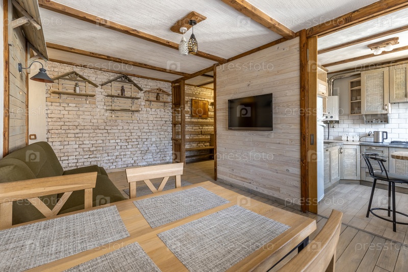 Яркая красочная гостиная и кухонный интерьер с деревянной мебелью