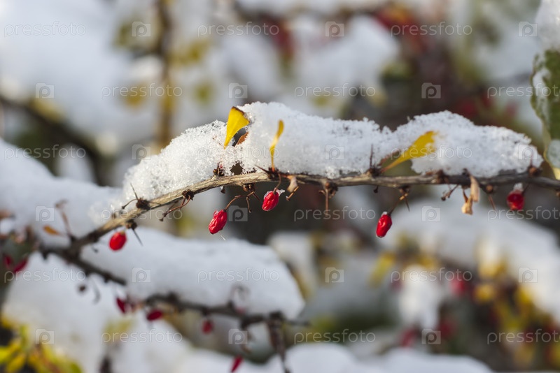 Варварская ветвь с характерными красными ягодами и шипами в снегу