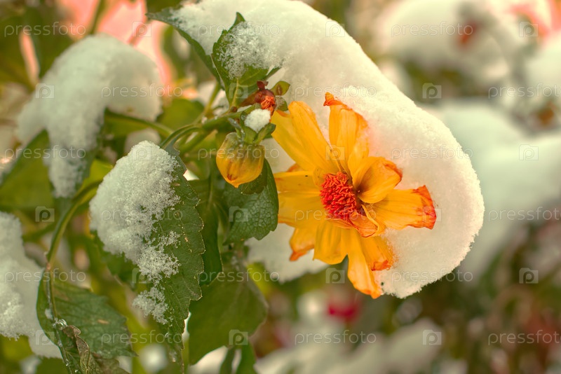 Желтая далия цветет под снегом