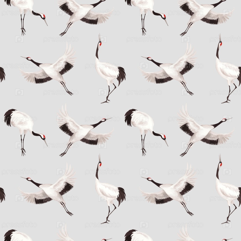 Бесшовный рисунок японских красных коронных журавлей на сером фоне. Акварельная иллюстрация крана. Нежная иллюстрация для ткани, обоев, поздравительных открыток, дизайна, декора и иллюстрации