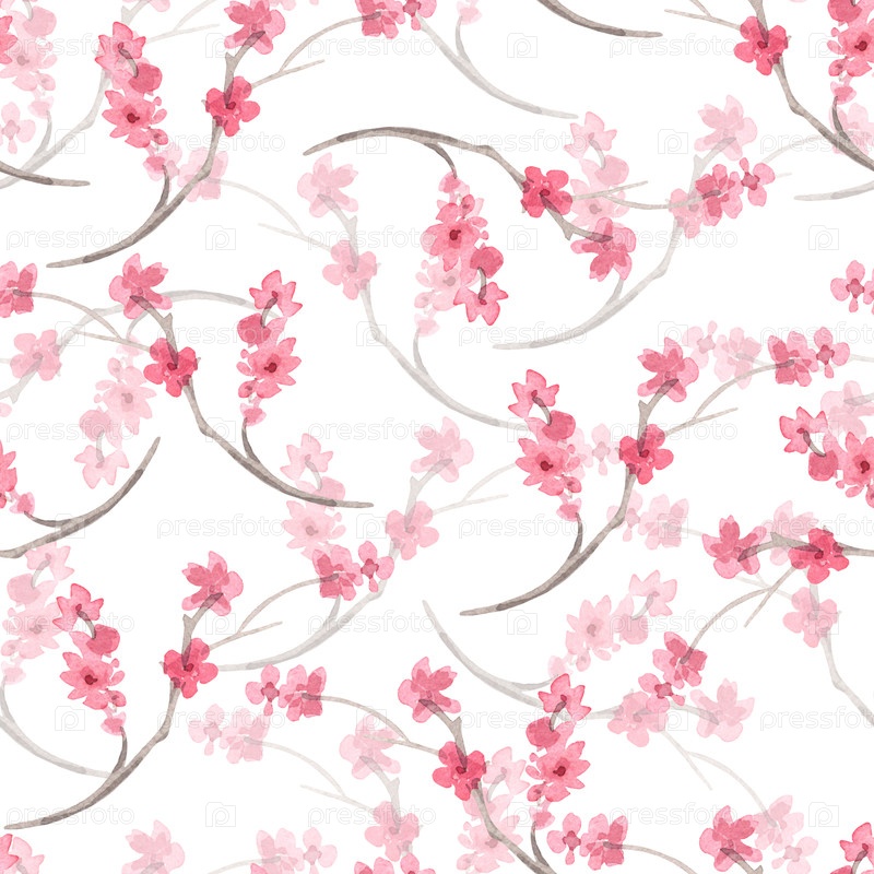 Бесшовный рисунок розовых ветвей вишни. Иллюстрация ручной акварели. Для ткани, обоев, поздравительных открыток, дизайна, декора и иллюстрации