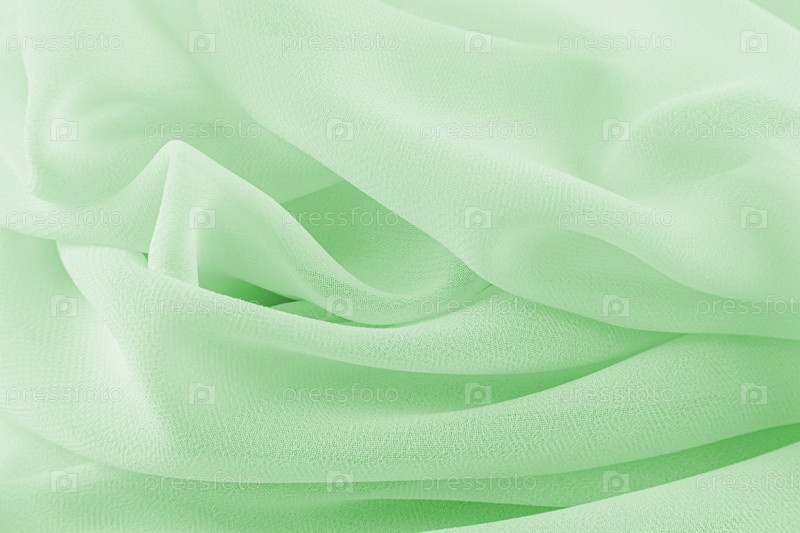 Элегантный прозрачный шифон в нежном зеленом или мятном цвете. Мягкие складки красиво лежат друг на друге. Праздничный фон. текстильная текстура