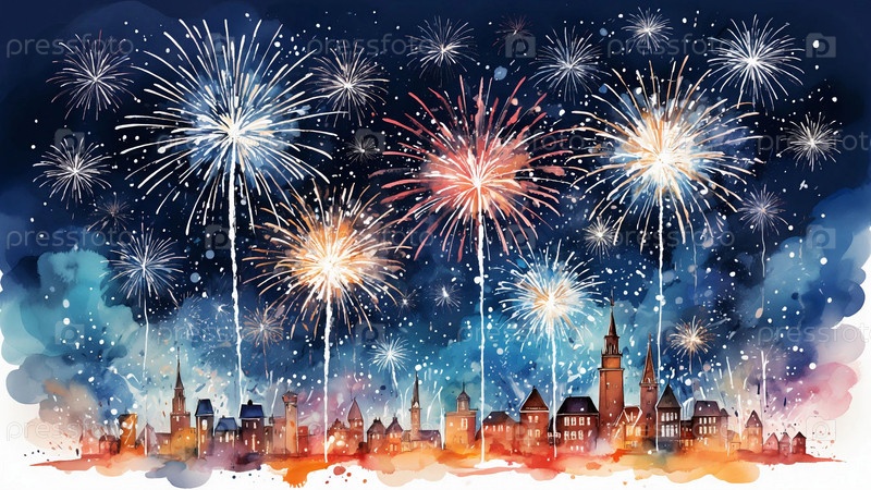 Салют над городом, акварель