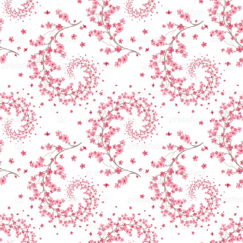 Бесшовный рисунок спиралеобразной вишневой выпечки и японского крана. Иллюстрация ручной акварели. Для ткани, обоев, поздравительных открыток, дизайна, декора и иллюстрации