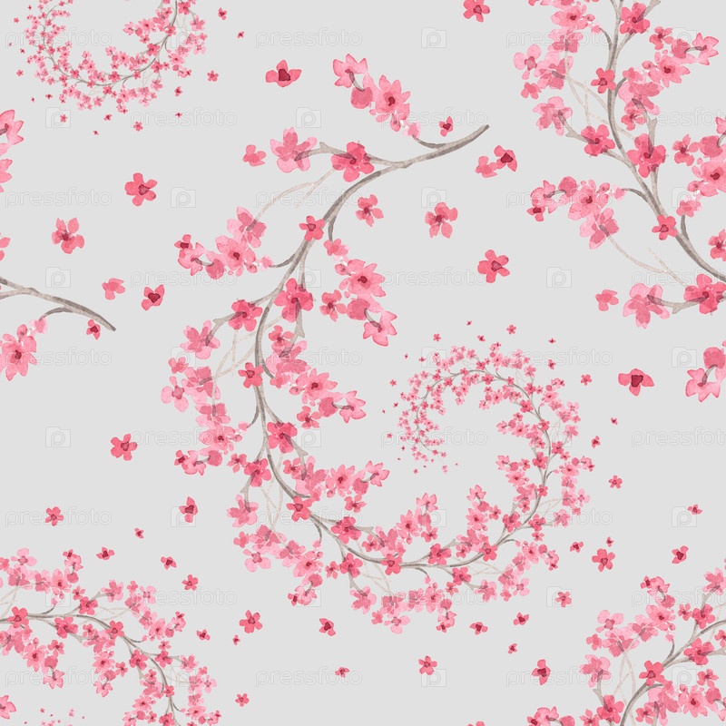 Бесшовный рисунок спиральных вишневых ветвей на сером фоне. Иллюстрация акварели ручной работы. Для ткани, обоев, поздравительных открыток, дизайна, декора и иллюстрации