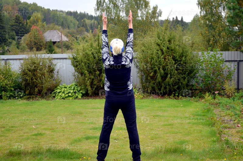 Пожилая женщина делает упражнения на свежем воздухе