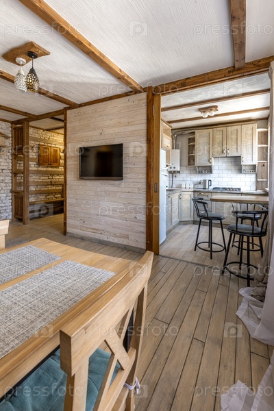 Яркая красочная гостиная и кухонный интерьер с деревянной мебелью
