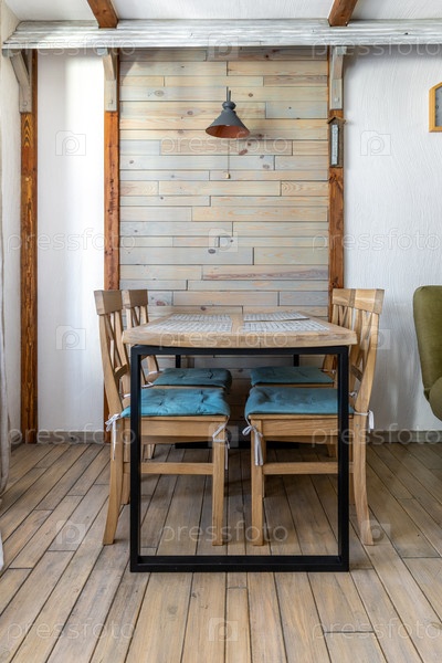 Уютная обеденная зона с деревянным столом и стульями в красочном интерьере