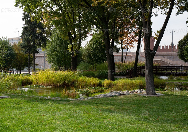 Красивый пруд в парке Зарядье в Москве летом