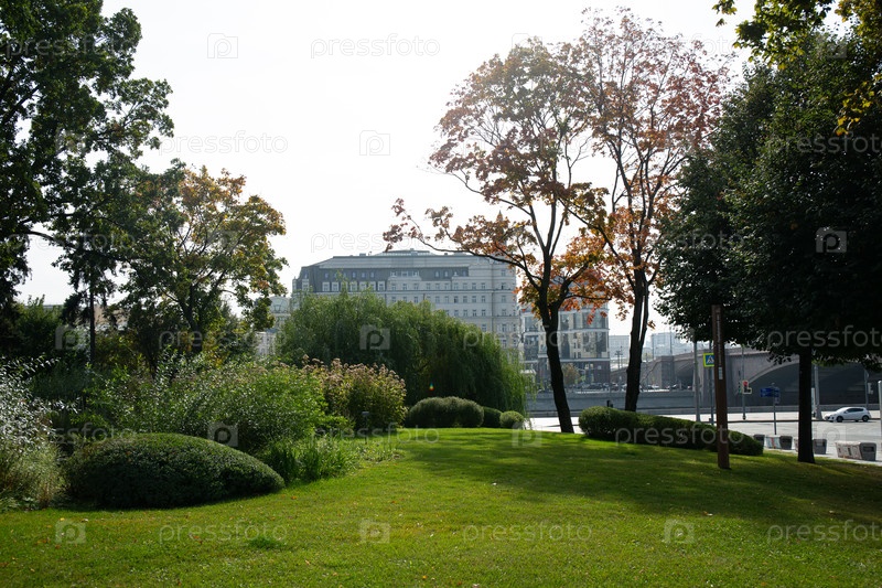 Красивая зеленая лужайка в парке Зарядье в Москве летом