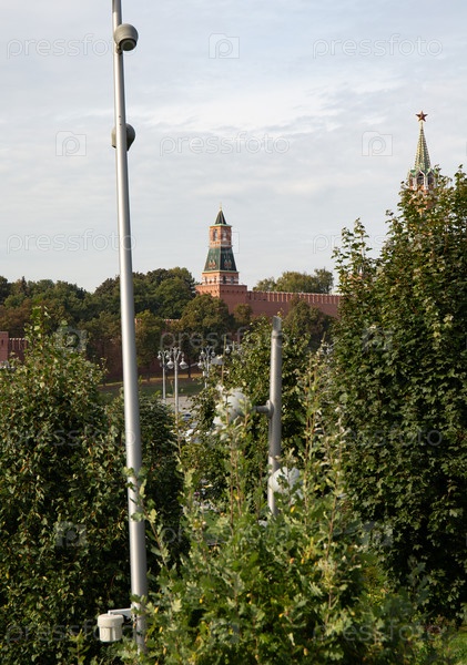 Прекрасный вид на кремлевские башни в парке Зарядье в Москве летом