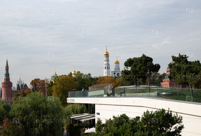 Прекрасный вид на кремлевские башни в парке Зарядье в Москве летом