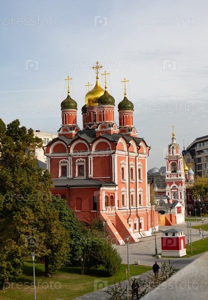 Красивая церковь у входа в парк Зарядье в Москве летом