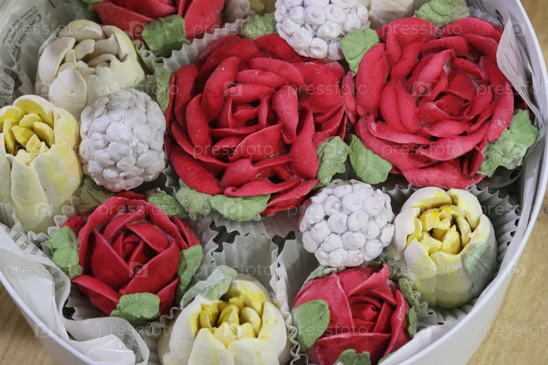 Цветы маршмелоу в коробке для шляп, тюльпаны и розы маршмелоу, дом-маршмелоу, крупный план