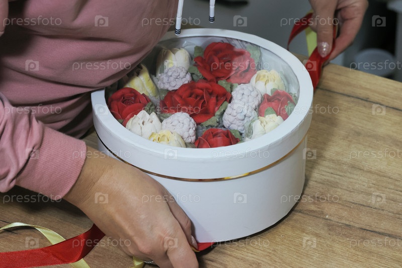 Предприниматель собирает цветы зефира в коробке с шляпой для подарка, связывая его цветными лентами, тюльпанами и розами