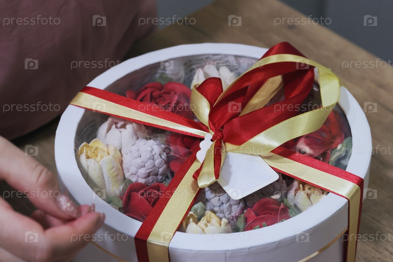 Предприниматель собирает цветы зефира в коробке с шляпой для подарка, коробку с домашним зефиром, связанным цветными лентами, тюльпанами и розами
