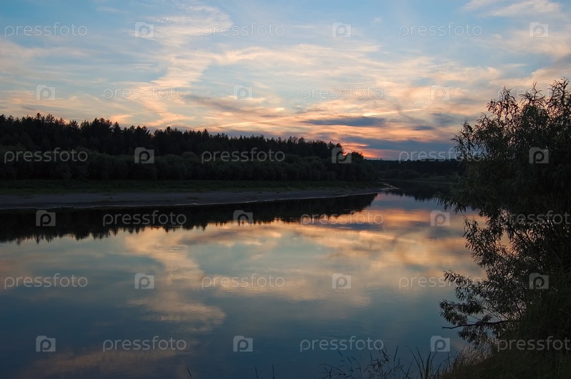 Красивый закат на реке Сосьва на Северном Урале, облака, окрашенные в красные, оранжевые цвета, лес, берег и их отражения в реке