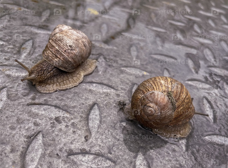 Две улитки летом в саду на асфальте