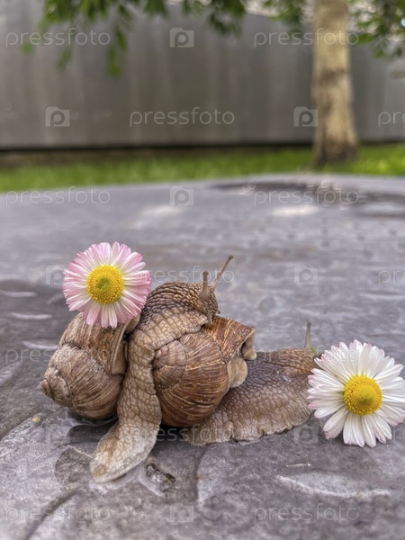 Две улитки летом в саду на асфальте