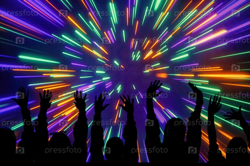 Молодые энергичные девушки на вечеринке поднимают руки против фона большого светодиодного экрана с абстрактным фоном многоцветных лучей