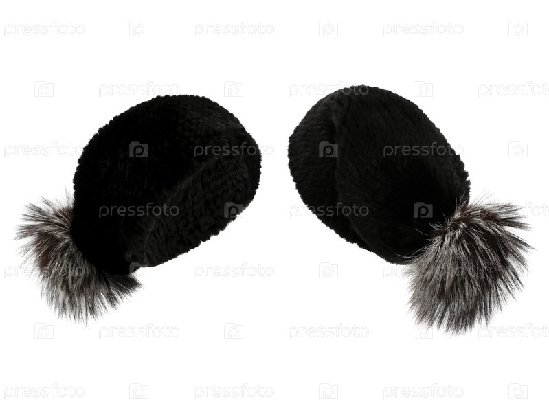 Черная меховая шапка с декоративным серым помпоном на изолированном белом фоне передний и задний взгляд