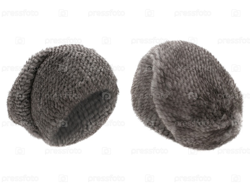 Серая меховая шапка на изолированном белом фоне передний и задний вид