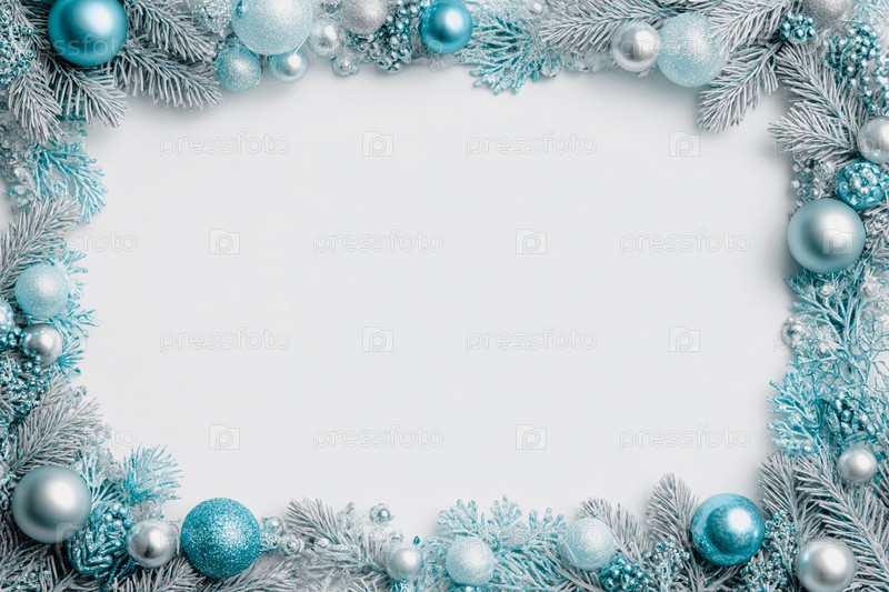 Праздничная рождественская оборона с синими и серебряными орнаментами и ветвями елей на белом фоне