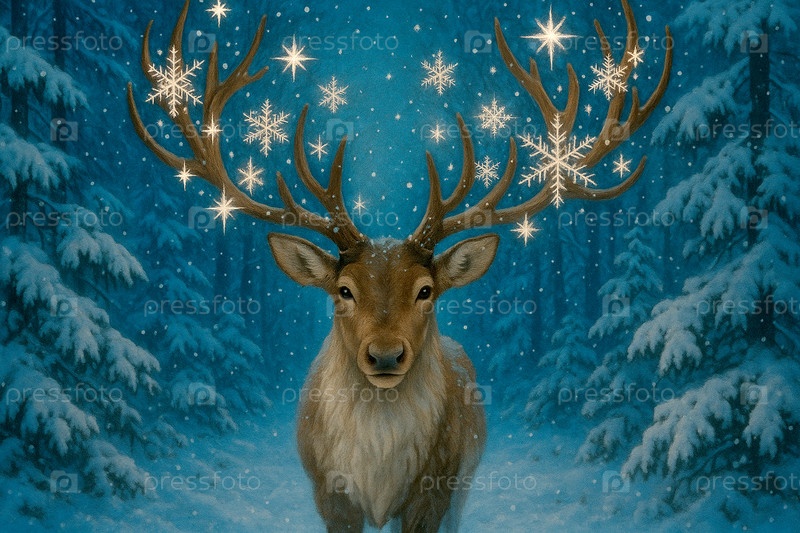 Волшебная зимняя сцена в снежных лесах с величественными оленями со светящимися рогами и снежинками