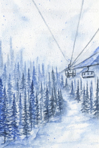 Акварель зимний пейзаж лыжной подъемник в лесу и горах