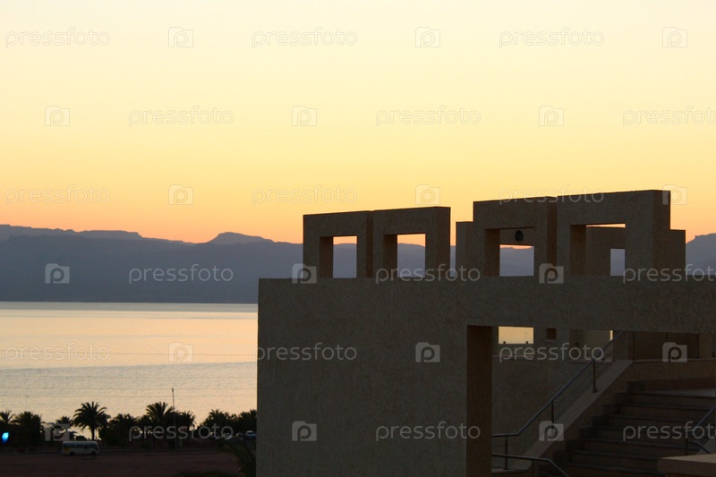 Закат, вид на море и уголок гостиничного здания в арабской стране