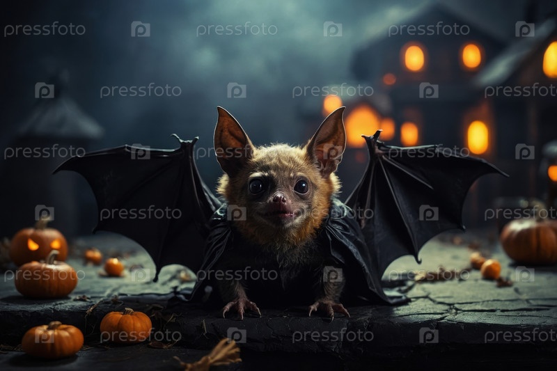 Генерирующая черная летучая мышь раскрывает крылья на темном страшном фоне Хэллоуина