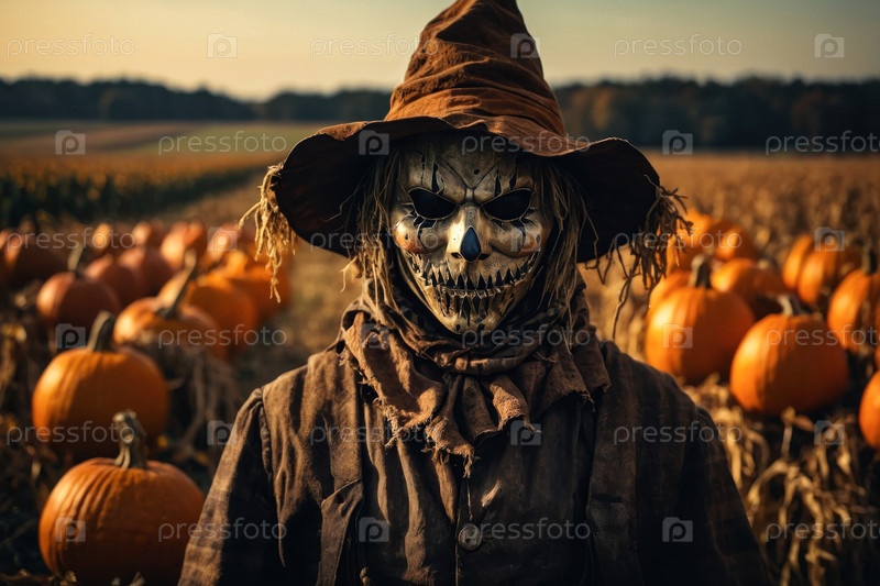 Generative пугающий богий на ферме с тыквами пугает ворон в Хэллоуин