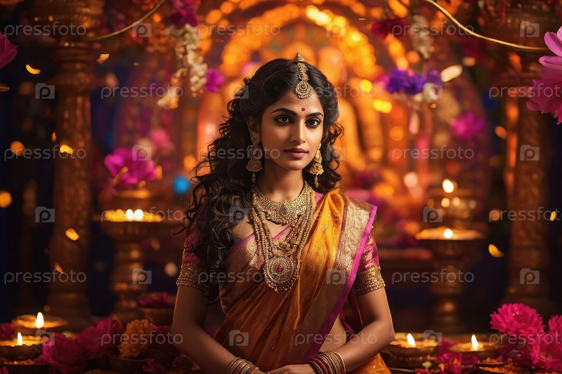 Молодая индийская женщина с портретом в традиционной одежде на фоне фестиваля Дивали