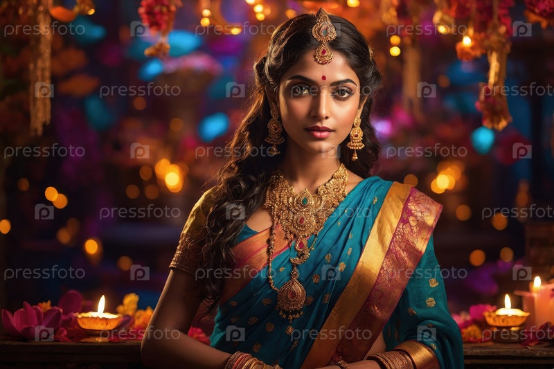 Молодая индийская женщина с портретом в традиционной одежде на фоне фестиваля Дивали
