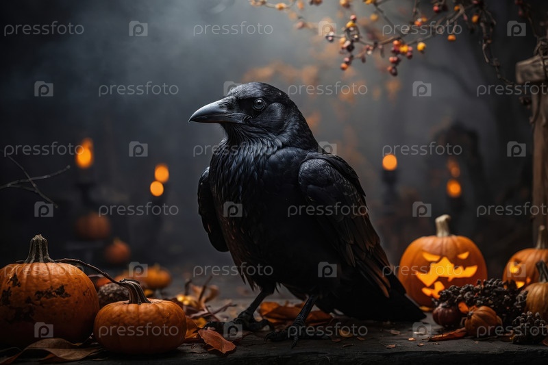 Черная ворона птица темный пугающий фон Хэллоуина с тыквой AI Generative