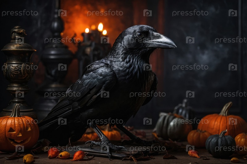 Черная ворона птица темный пугающий фон Хэллоуина с тыквой AI Generative