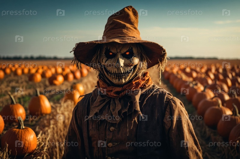Generative пугающий богий на ферме с тыквами пугает ворон в Хэллоуин