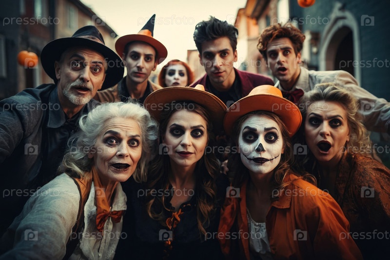 Групповые друзья в костюмах Хэллоуина позируют для генеративной фотосессии с селфи AI