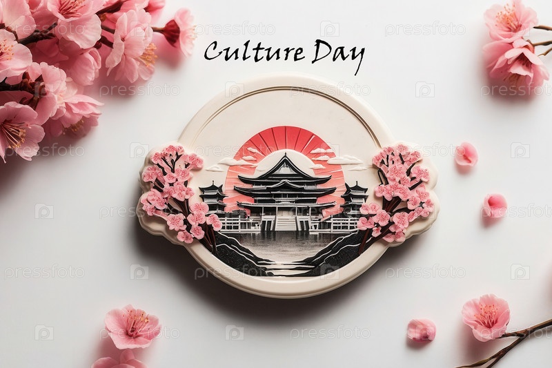 День культуры Японии с горами, рекой, вишневыми цветами, солнцем и небом