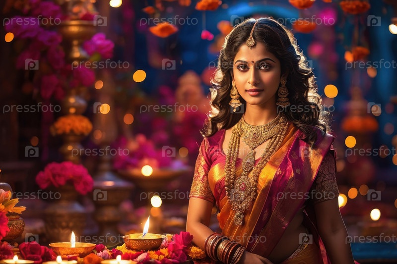Молодая индийская женщина с портретом в традиционной одежде на фоне фестиваля Дивали